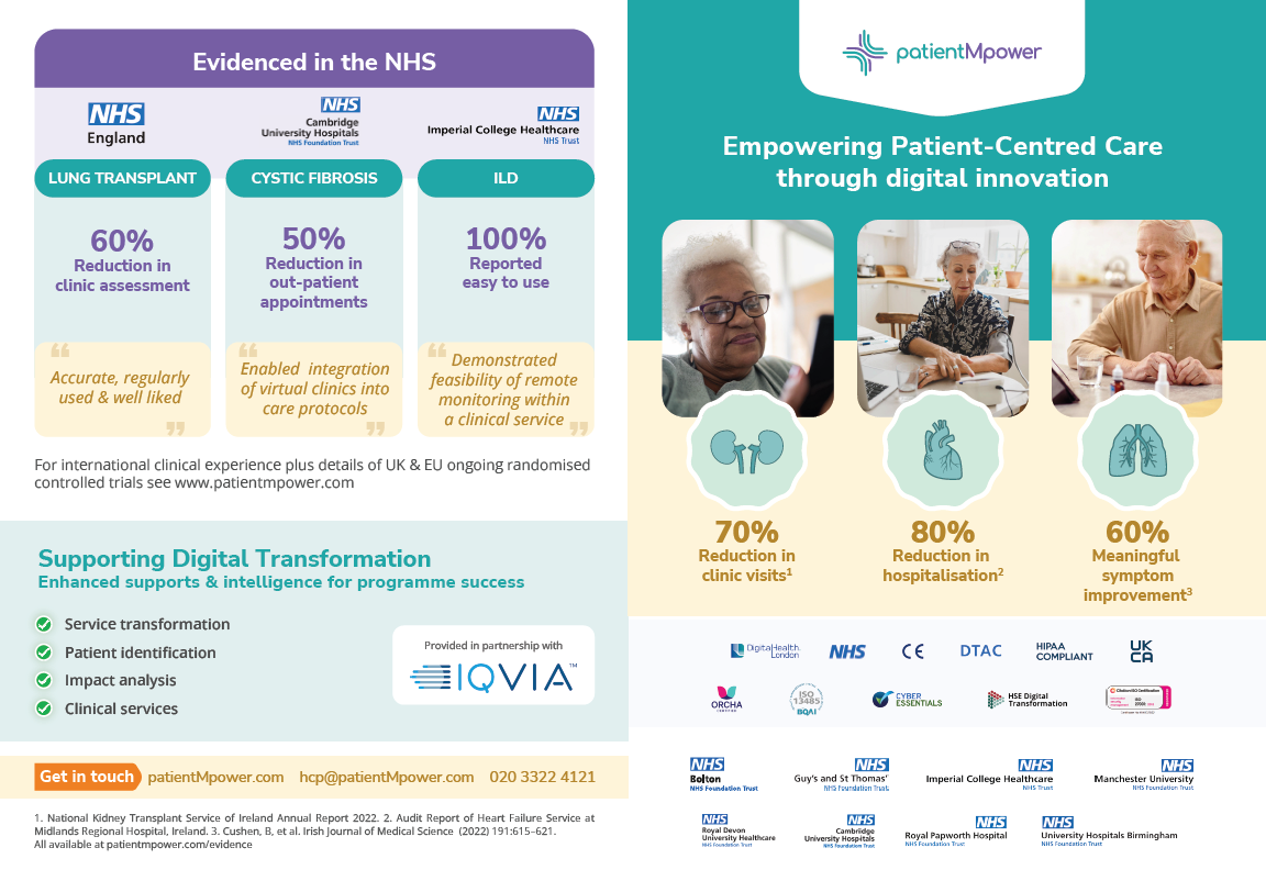 Case studies have shown use of the platform reduced clinic visits after lung transplant by up to 66%, whilst enabling rapid identification of potential complications. Across other clinical areas, use of patientMpower has shown: